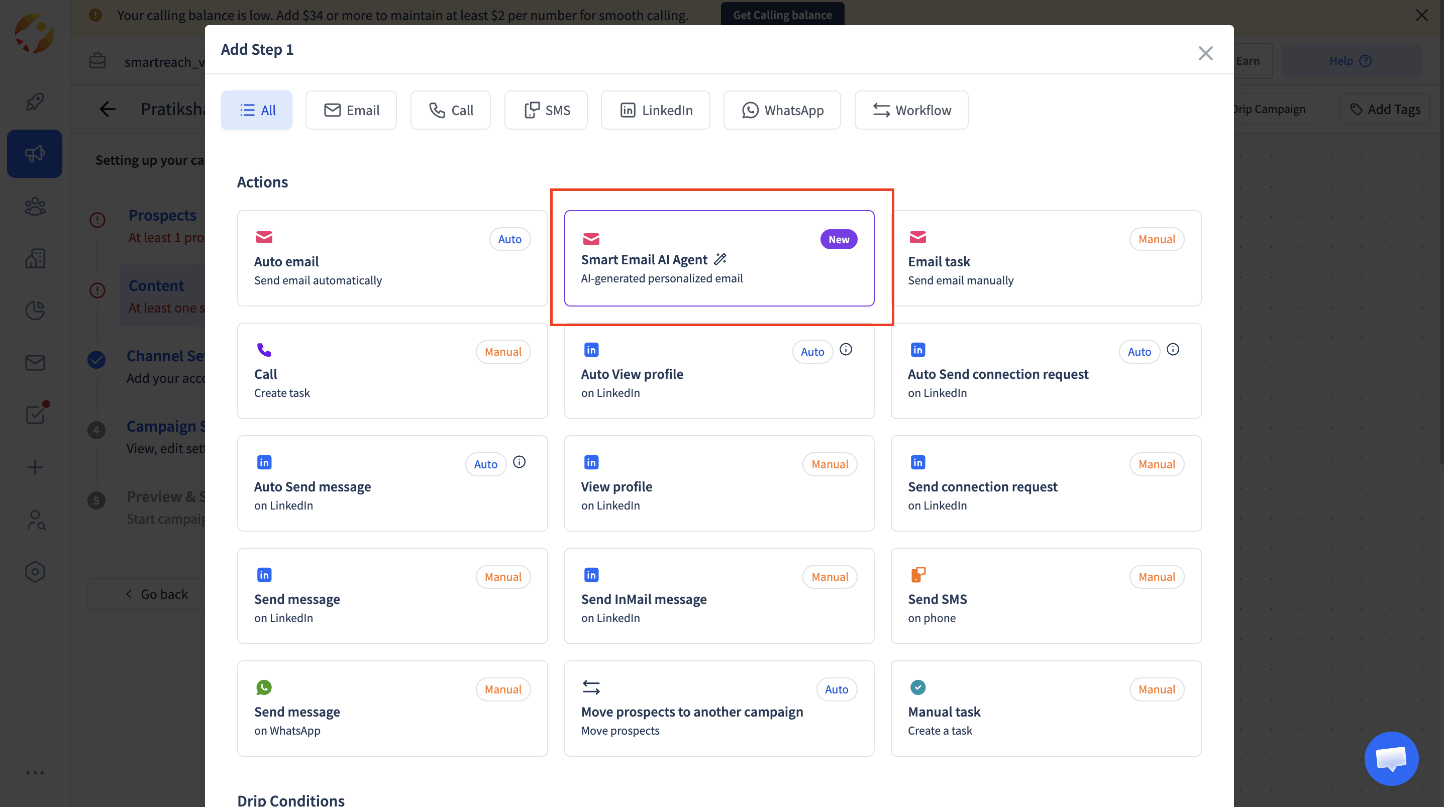 - Select Smart Email AI Agent from the Email tab under Actions.
