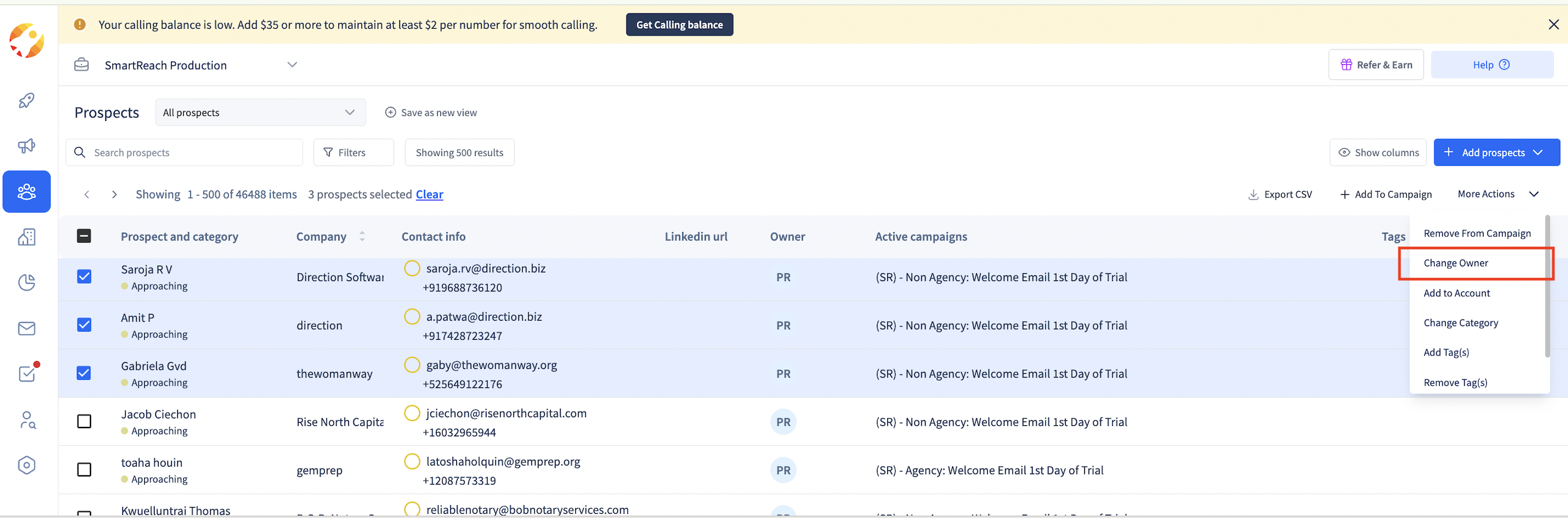 Bulk select prospects and assign them to a specific owner under More Actions tab