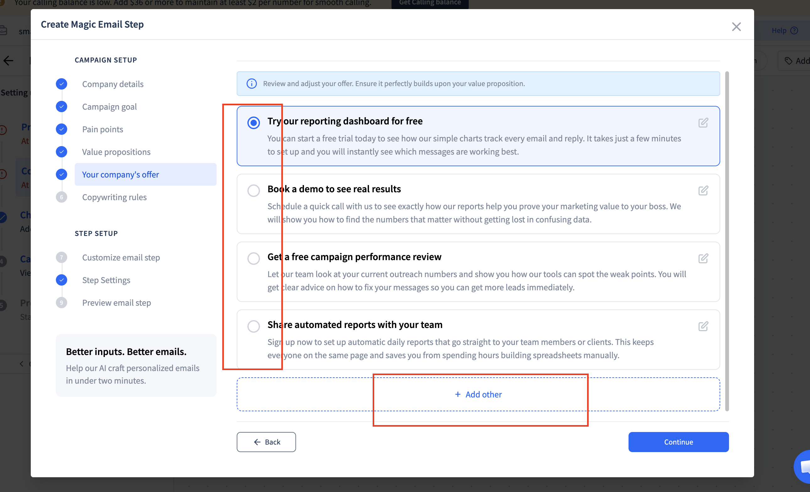 SmartReach auto-generates the most relevant offer options based on your previous inputs. You'll see three to four suggestions. Select one, or add your own using the Add other option below the suggestions.