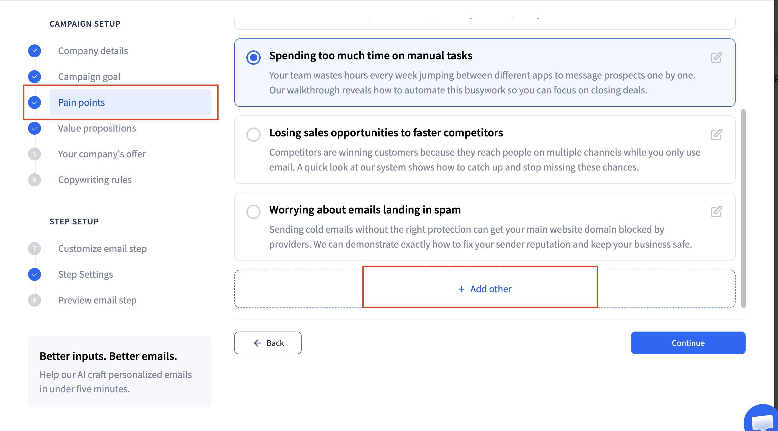 SmartReach auto-generates pain point options based on your campaign goal and company details. These represent challenges faced by your prospects and are tailored to your industry.