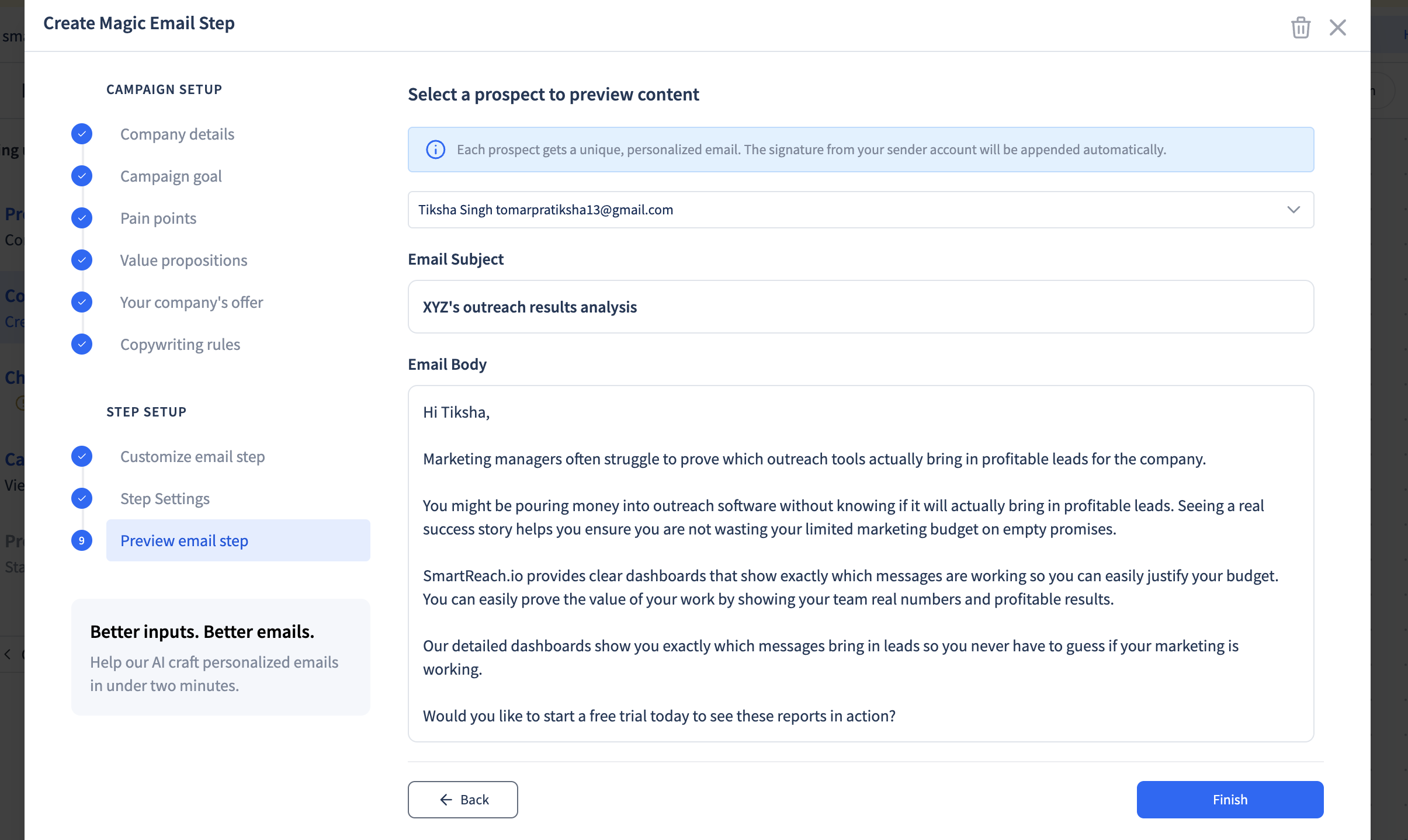 Magic Email is an AI-powered feature in SmartReach that creates hyper-personalized cold email content for each prospect in your campaign. Instead of writing templates manually, it uses lead data combined with your company details, campaign goals, and prospect data to generate unique subject lines and email bodies at scale.