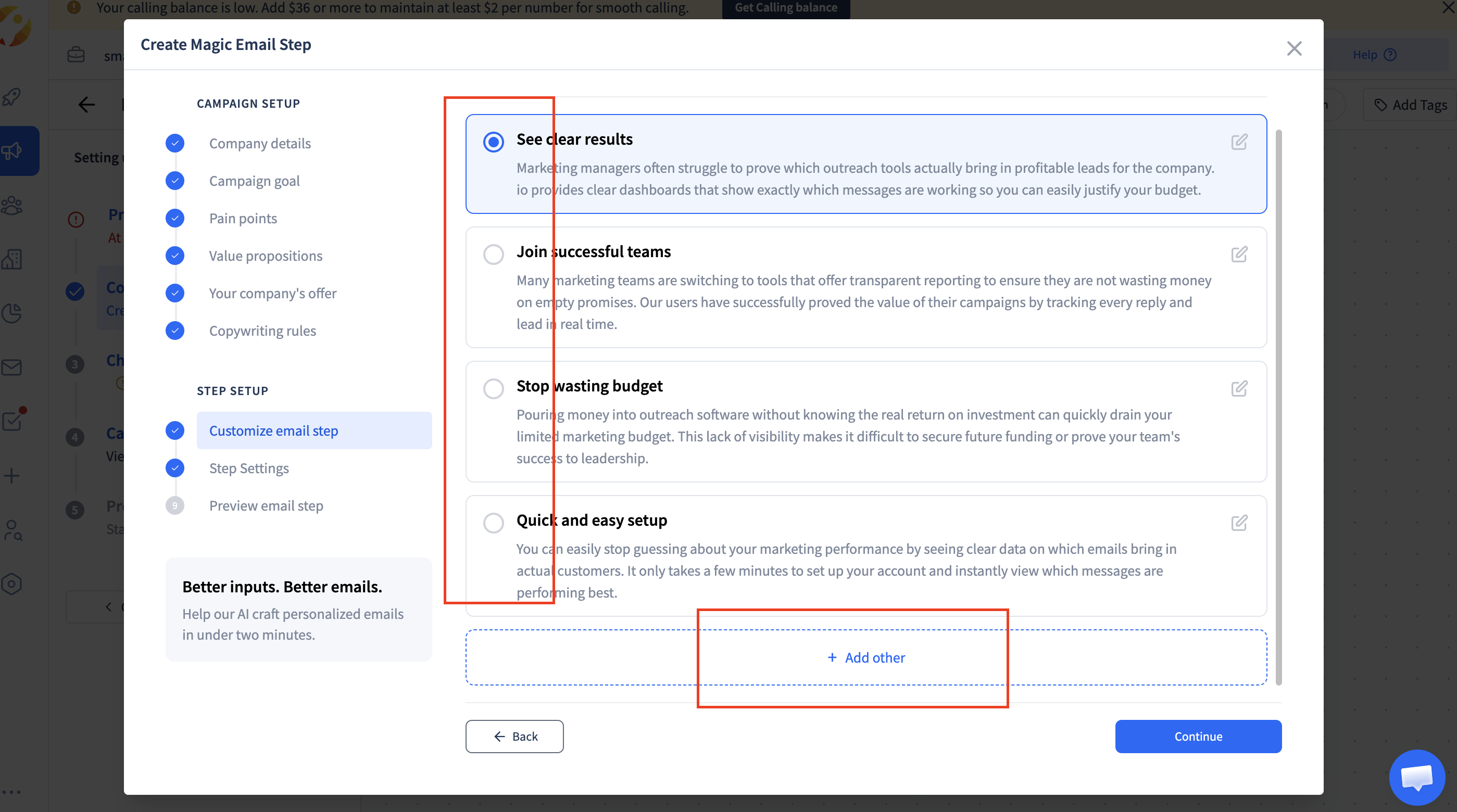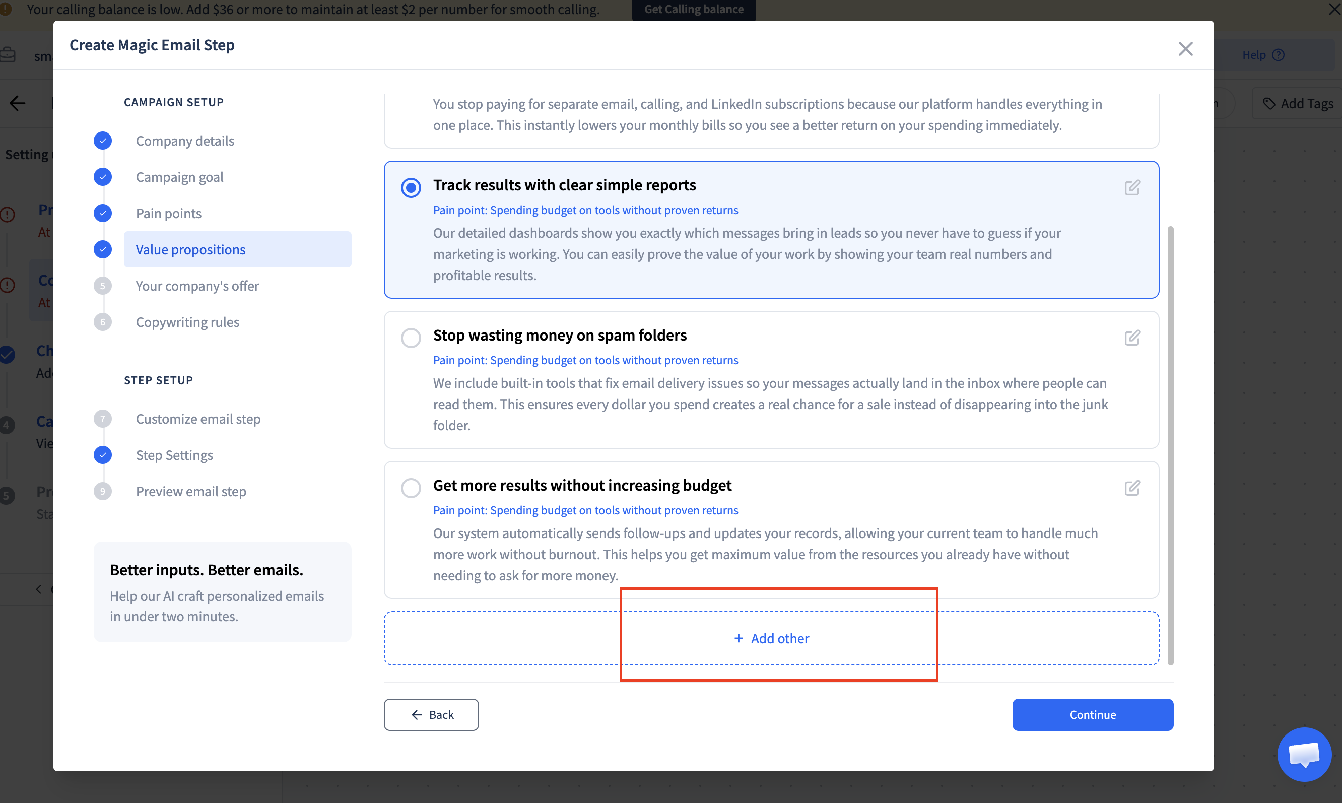 You'll see three to four suggested options. Pick the one that fits, or add your own custom value proposition using the Add other option below the suggestions.