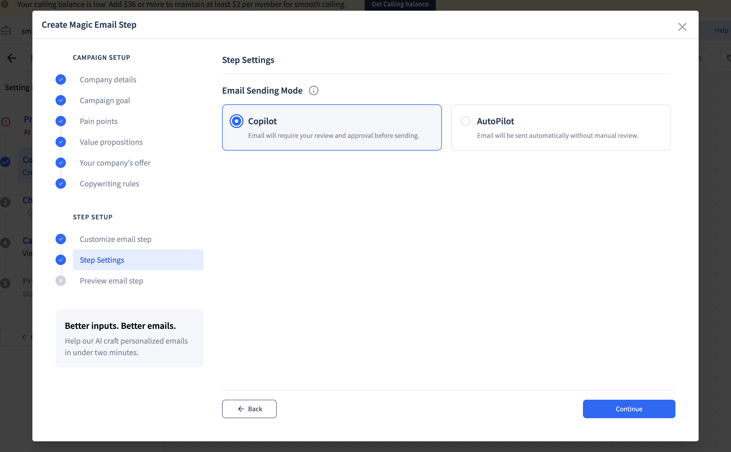 Tip: Start with Copilot mode. As Magic Email learns your writing style from your edits, you can switch to Autopilot for faster execution. You can change modes anytime, even after the campaign is live.