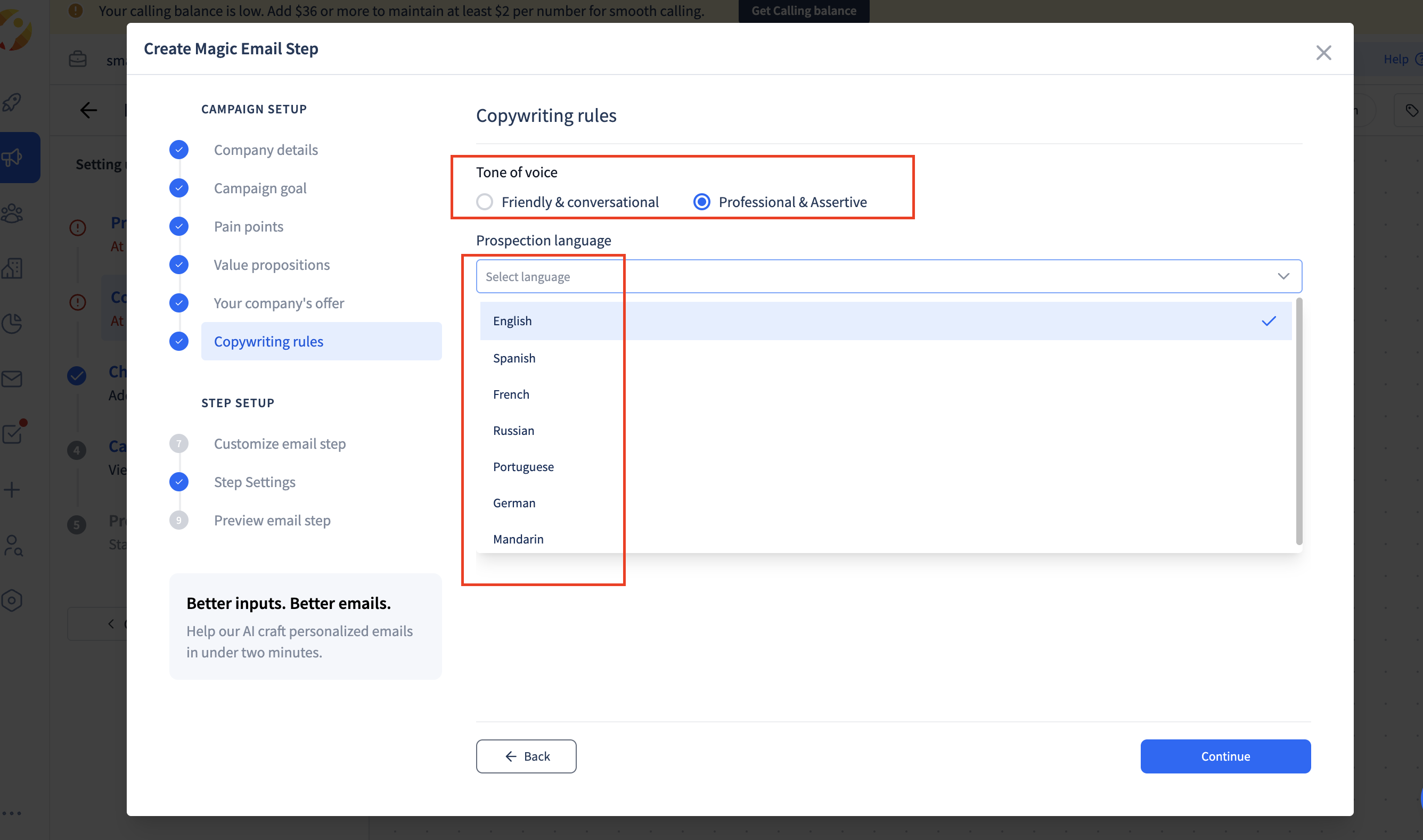 - Campaign-level setup (done once): Company details, campaign goal, pain points, value propositions, your offer, and copywriting rules.