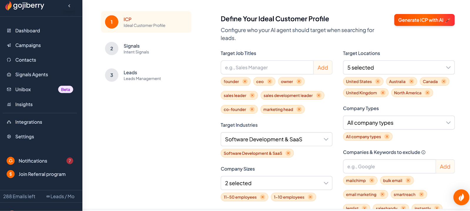 Tip: Start with 10-12 signals for faster results. Using only 1-2 signals will slow lead generation.