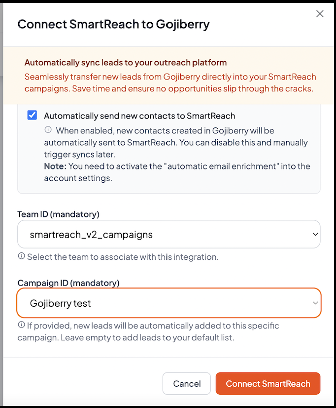 What happens next: New contacts created in Gojiberry.ai will automatically transfer to your selected SmartReach campaign.
