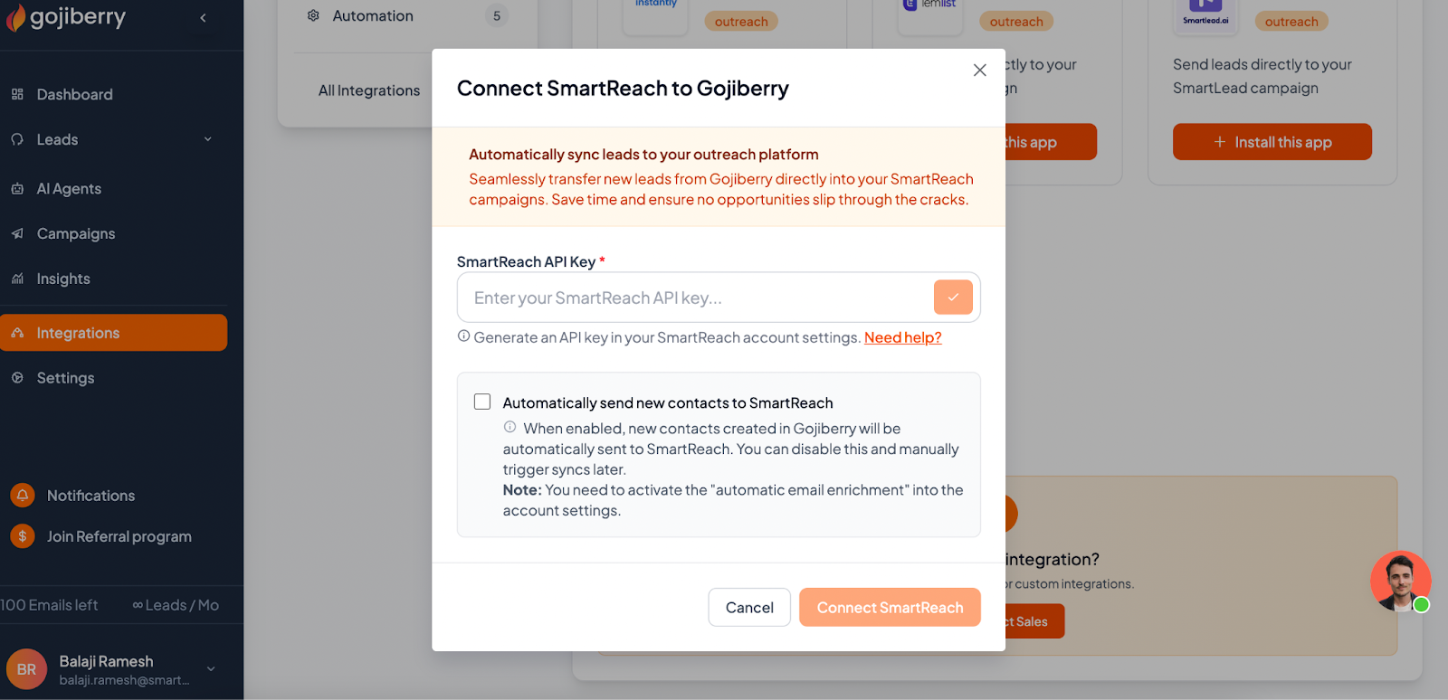 Step 2: Connect Gojiberry.ai to SmartReach