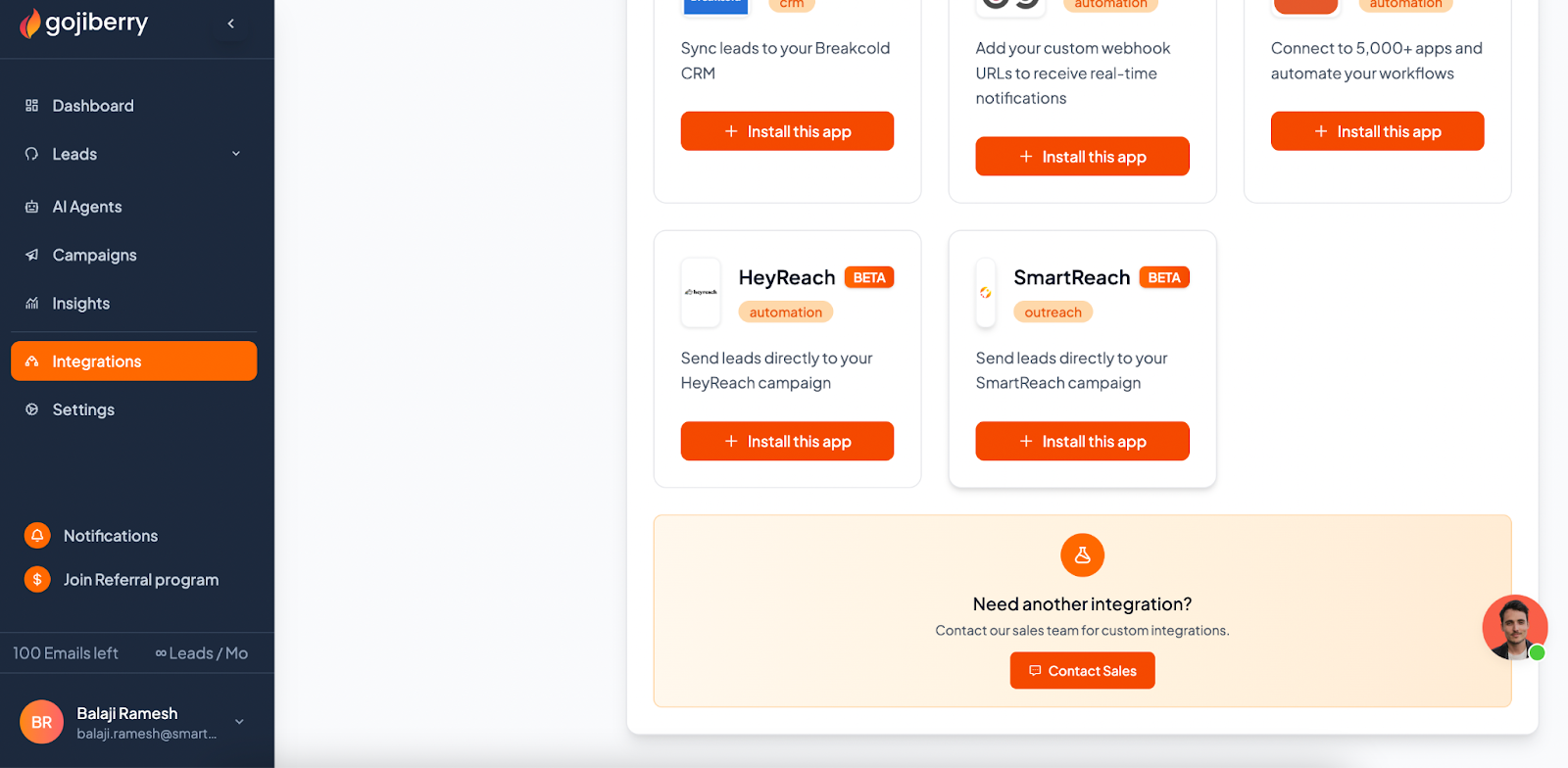 - Verify your SmartReach integration in Gojiberry Settings > Integrations