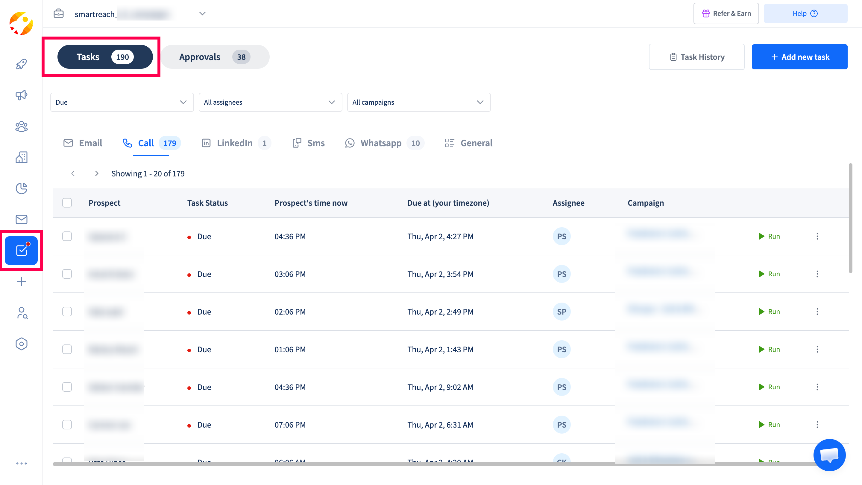 Manage daily multichannel tasks with SmartReach task manager. Organize LinkedIn, calling, and other outreach activities in structured workflow interface.