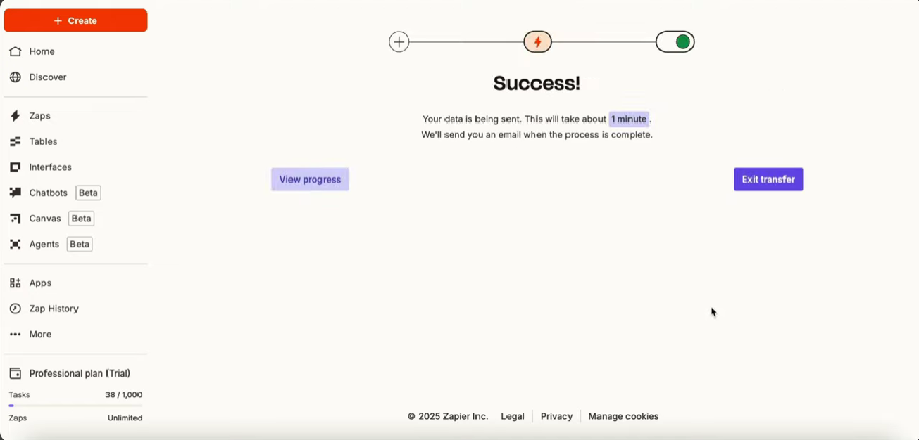 - Expect an email notification when the transfer completes (may take a few minutes).