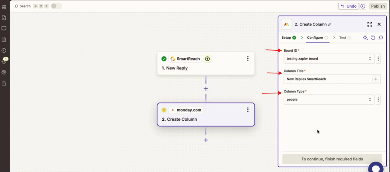 Conclusion With this Zapier integration, your Monday.com boards and SmartReach campaigns will work seamlessly together, automating lead flows and status updates for efficient sales processes. Customize as needed for your team's needs, and explore additional triggers/actions for advanced setups. For more help, refer to our full Zapier guide or join the Slack community.