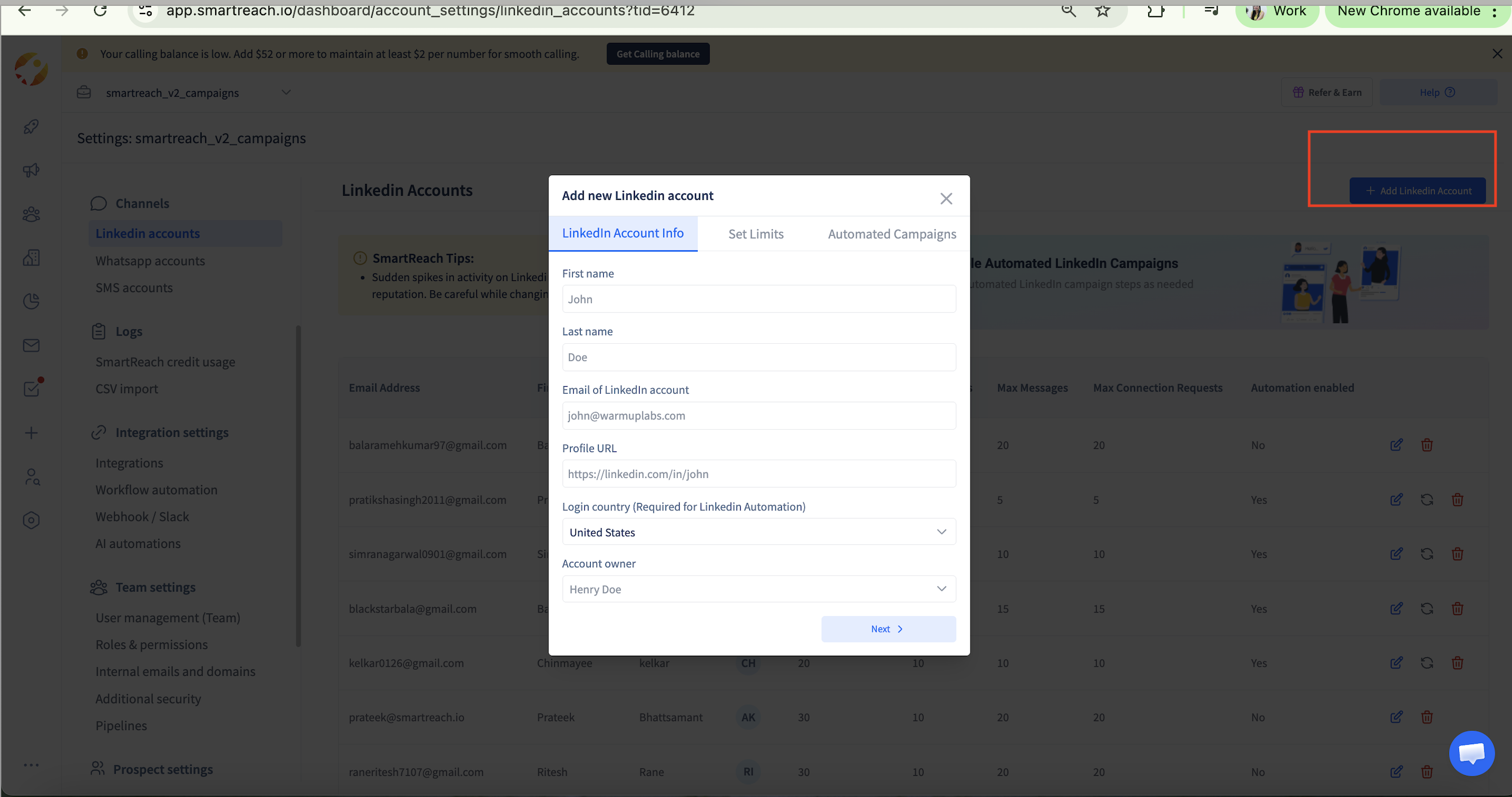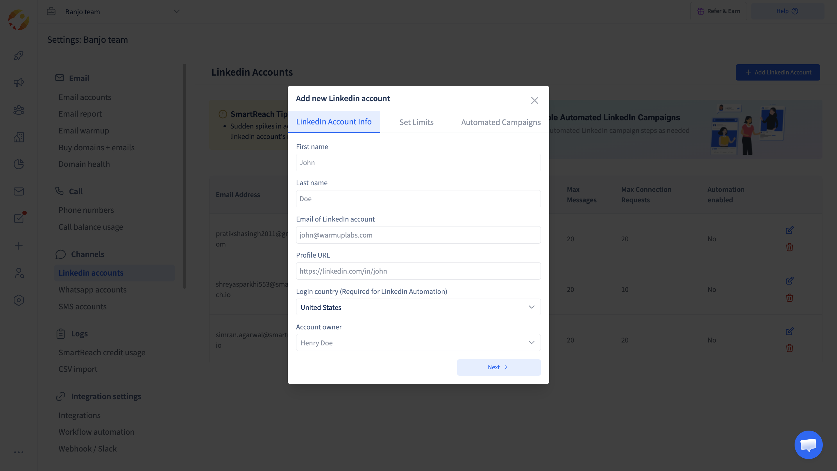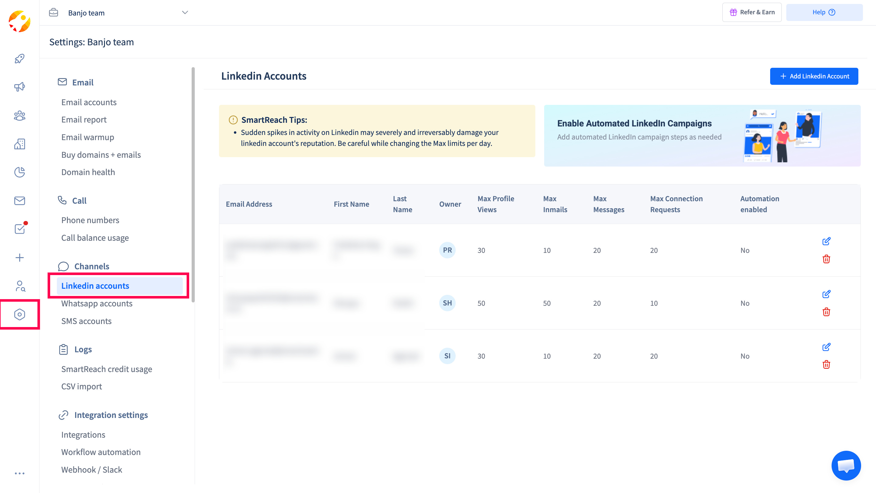 Step 2: In SmartReach navigate to LinkedIn Settings