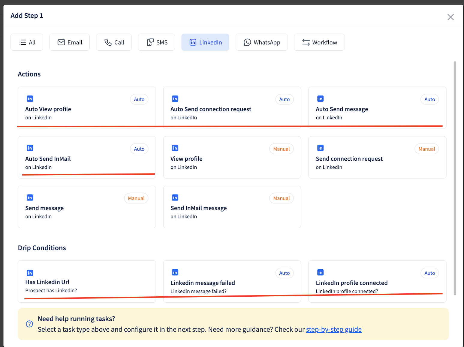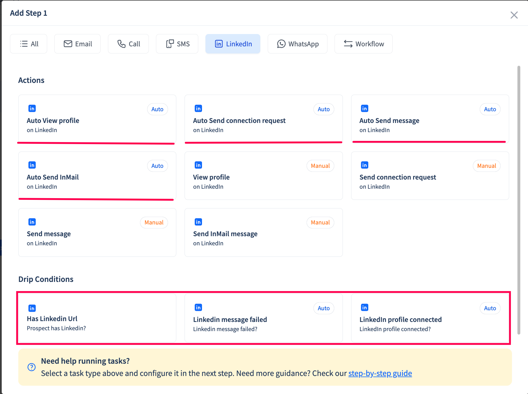 Select the Auto LinkedIn Steps or conditions to execute the Auto linkedIn Campaigns