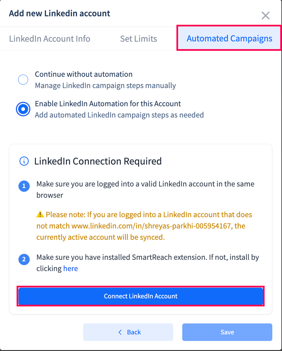 - Step 5: Select Enable LinkedIn Automation for this Account