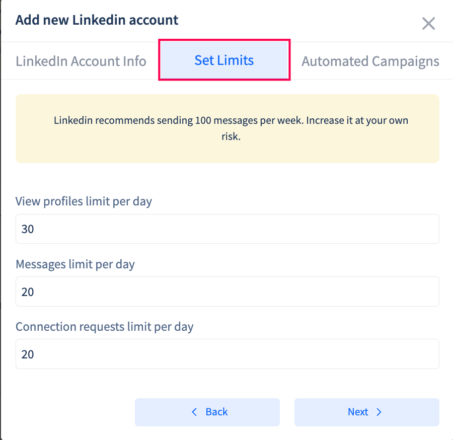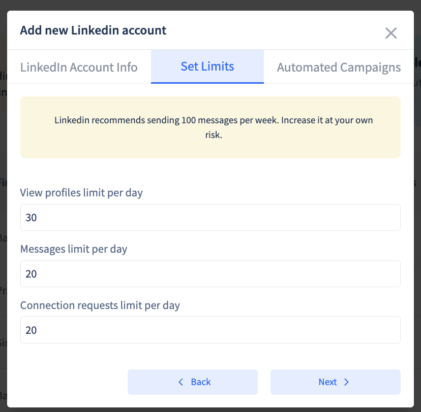 Set up your limits for sending connection requests, view profiles, messages. Set lower limits to keep your account more secure. Check out LinkedIn best practices.