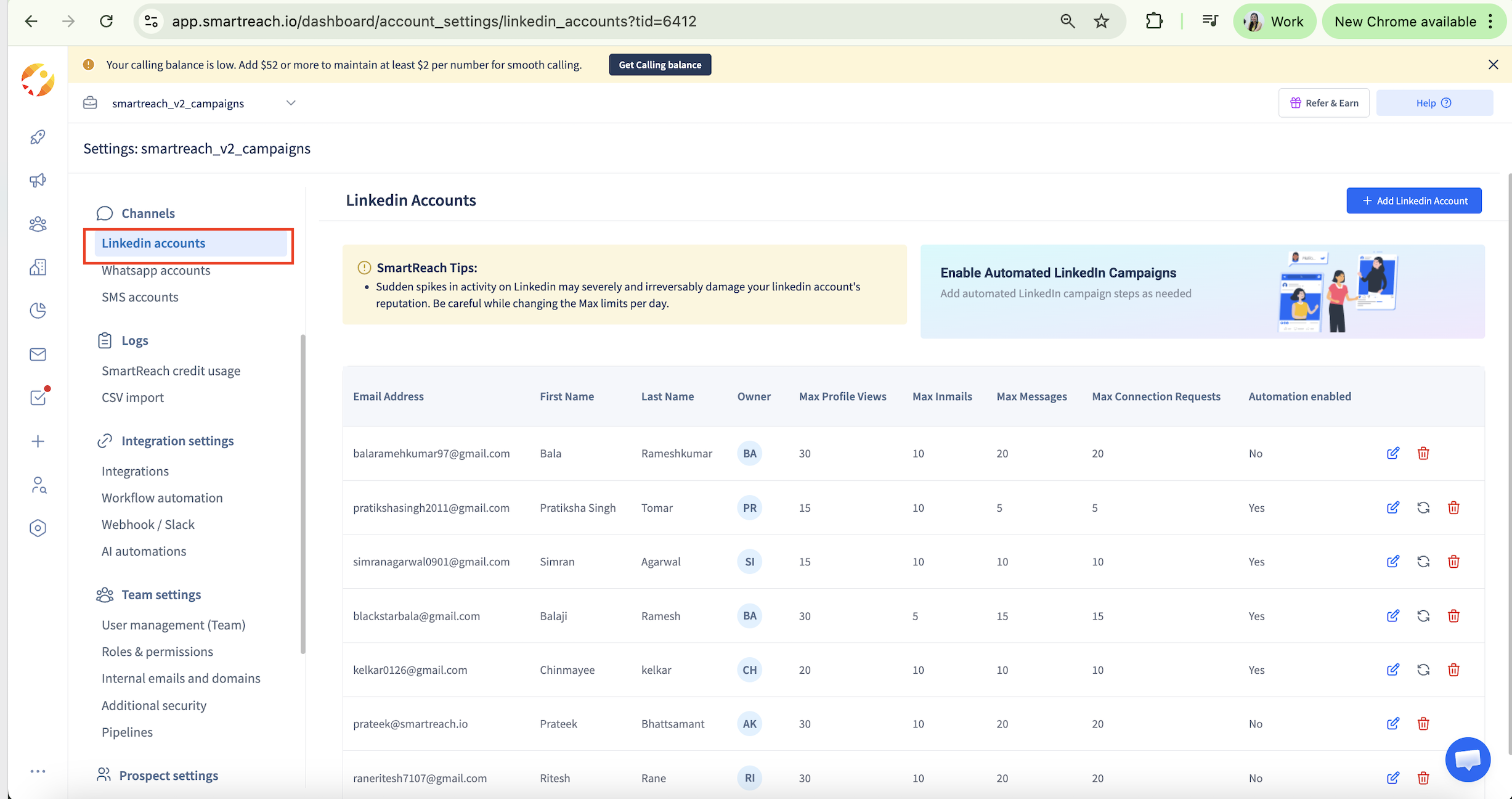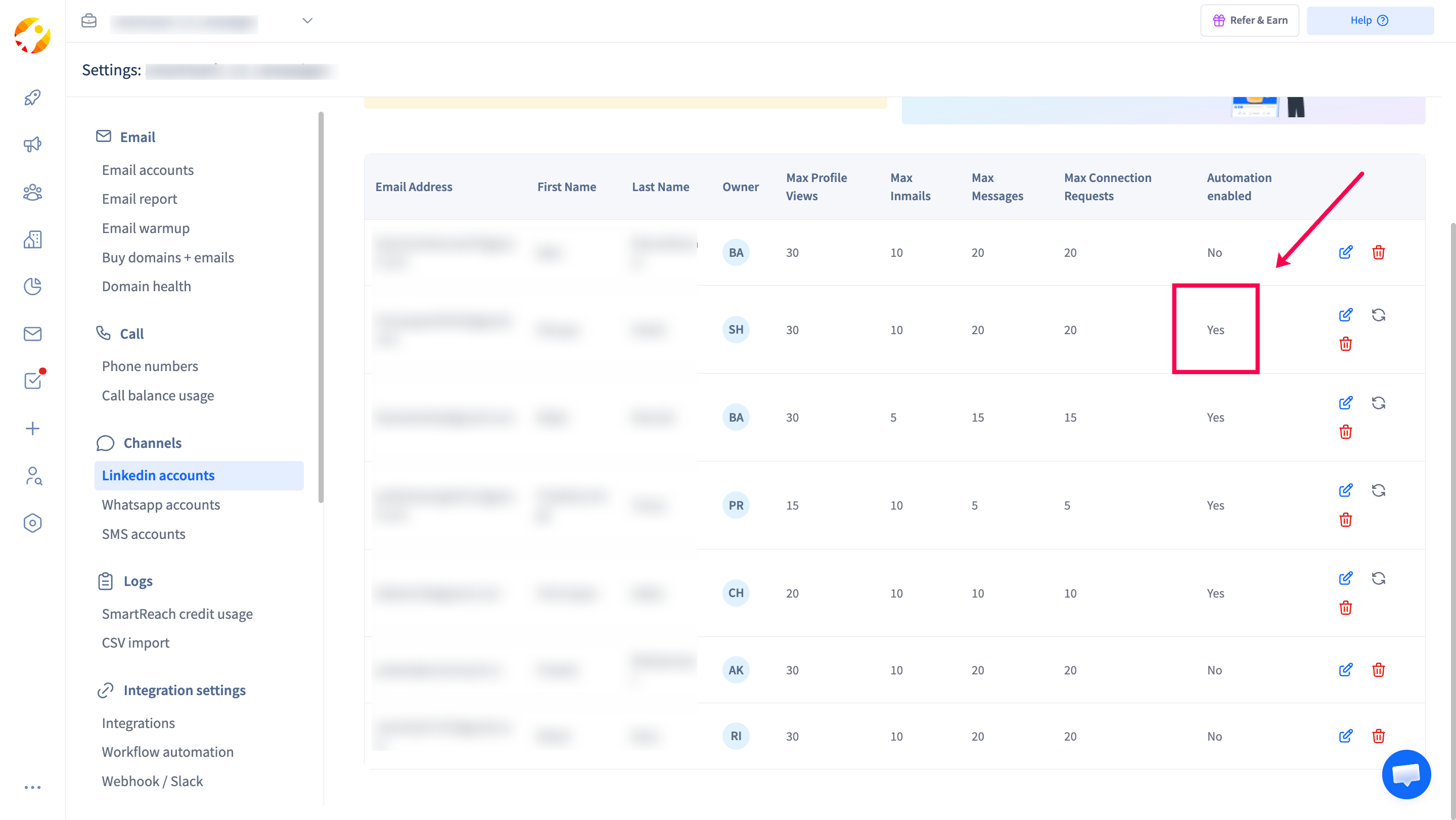 Step 5: Once authorised, SmartReach.io establishes a session for your LinkedIn account. Refresh your page and see if automations have been enabled or not. You should see 'yes' under automations enabled column.
