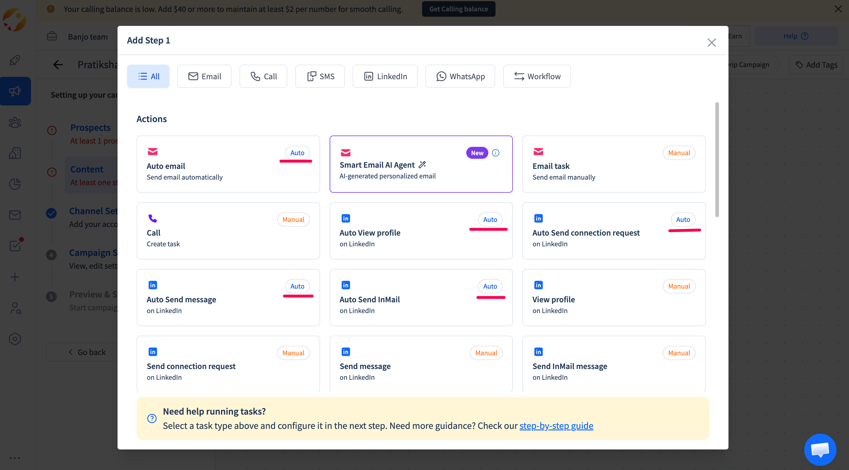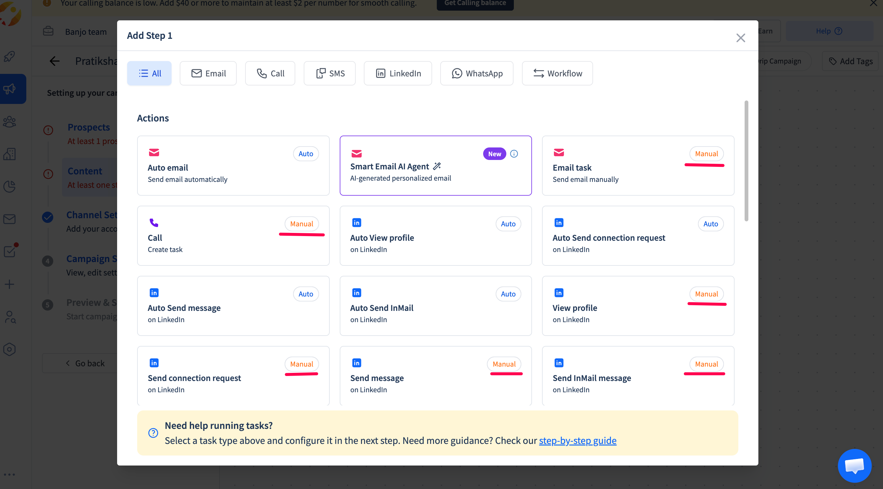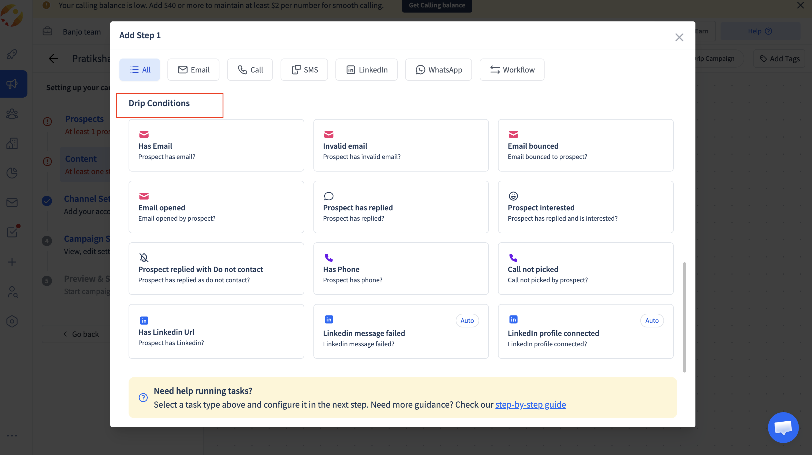 Add Your First Step for your drip workflow. (Email, Call, LinkedIn etc.) You can set up any of the following steps