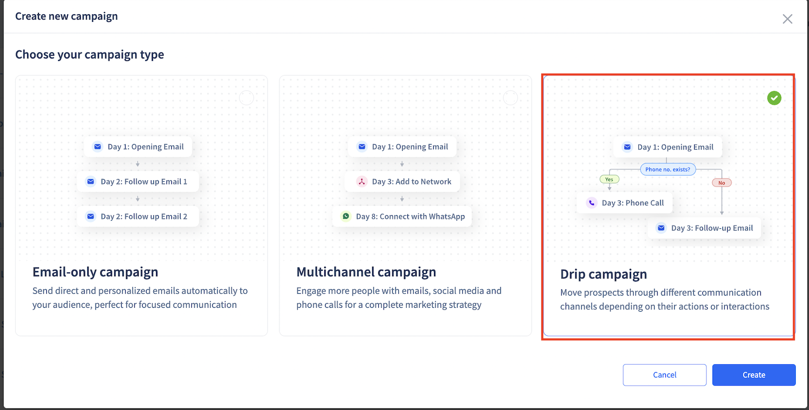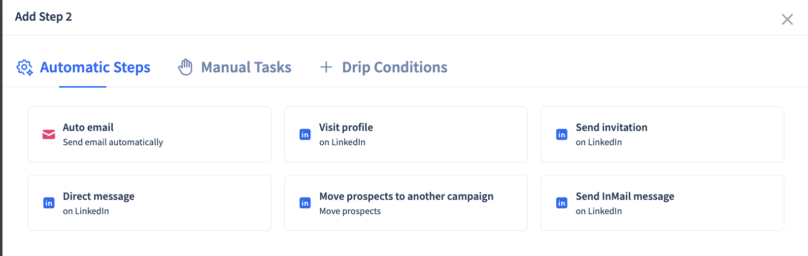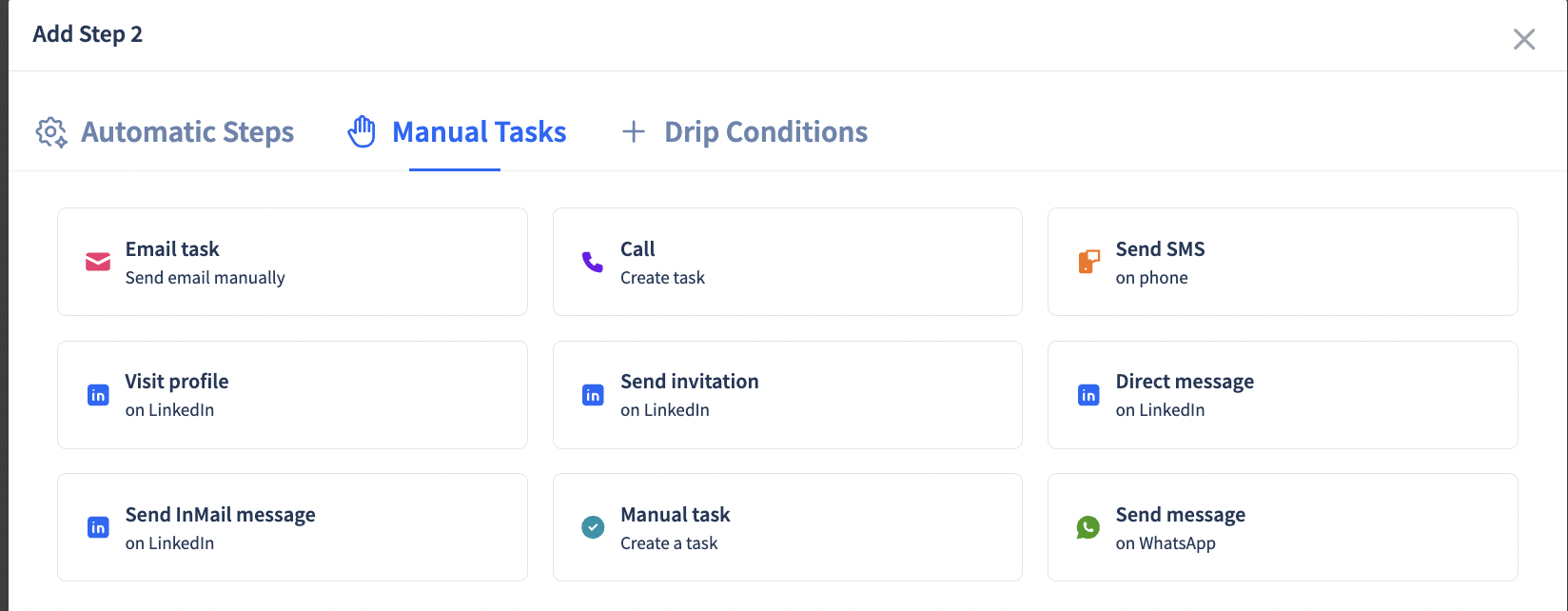 Add Your First Step for your drip workflow. (Email, Call, LinkedIn etc.) You can set up any of the following steps