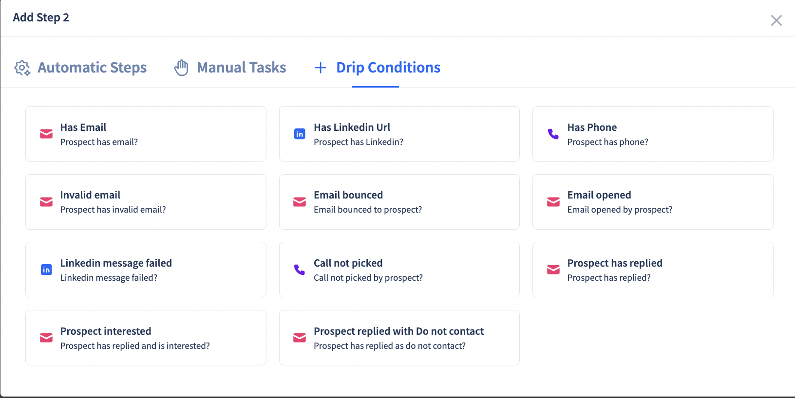 Multichannel Drips use conditional workflows to adapt outreach based on a prospect’s behavior or available data.