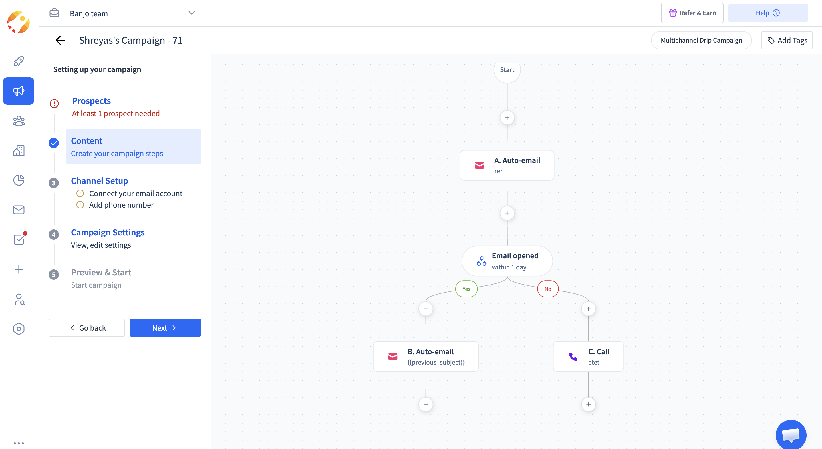 Now for example You send an email (Day 1). Depending on what the prospect does (or doesn’t do), you pick the next move. Click on the Plus Icon (+).Every condition has two options: “Yes” or “No”. Based on this, you decide what happens next in your workflow Each drip condition leads to two possible paths—