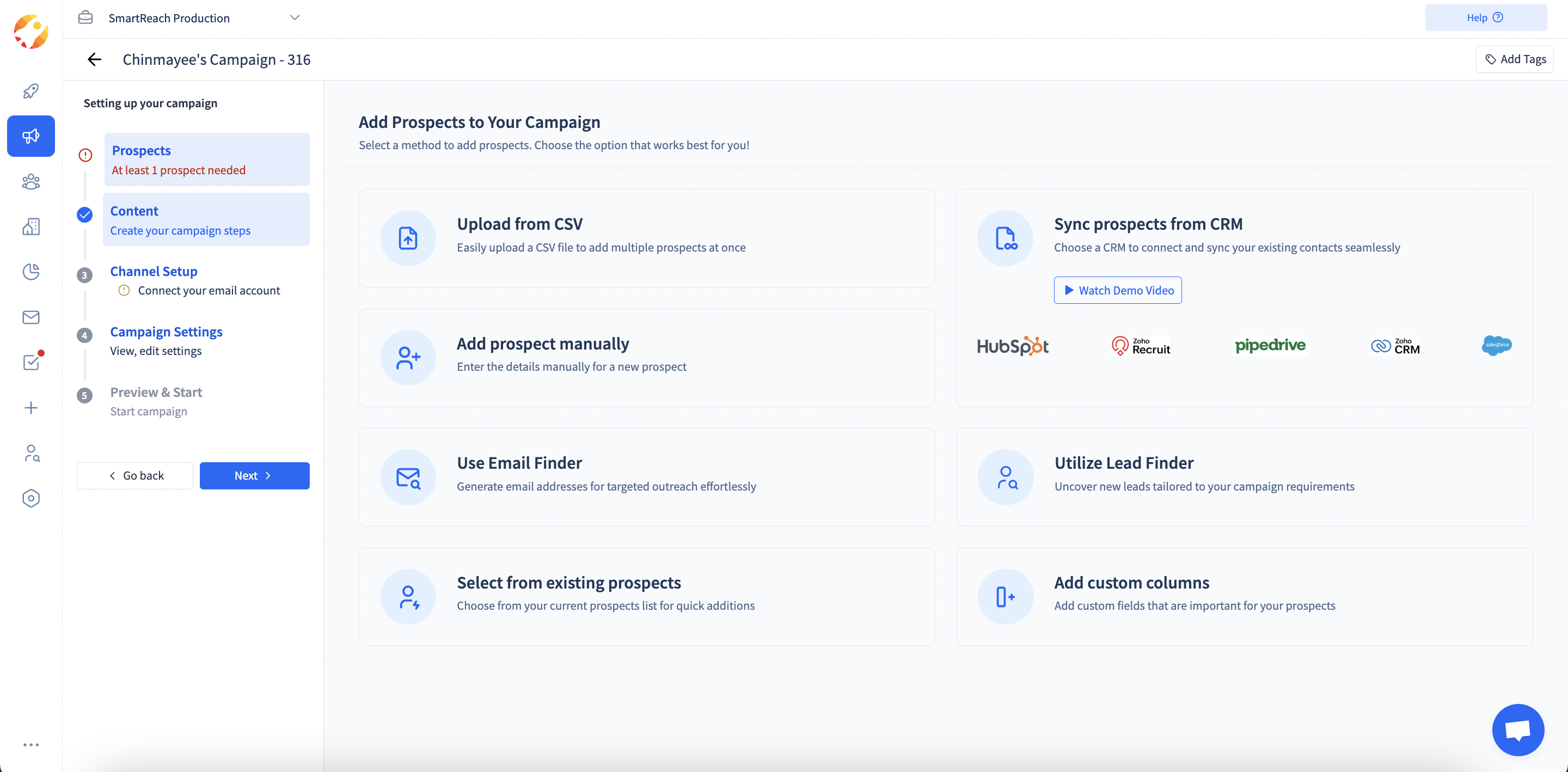 On the first step to set up your campaign it will ask you to add prospects to your campaign, on more information about adding prospects Click here` Once you add the prospects you can skip to the content section to add your first workflow)