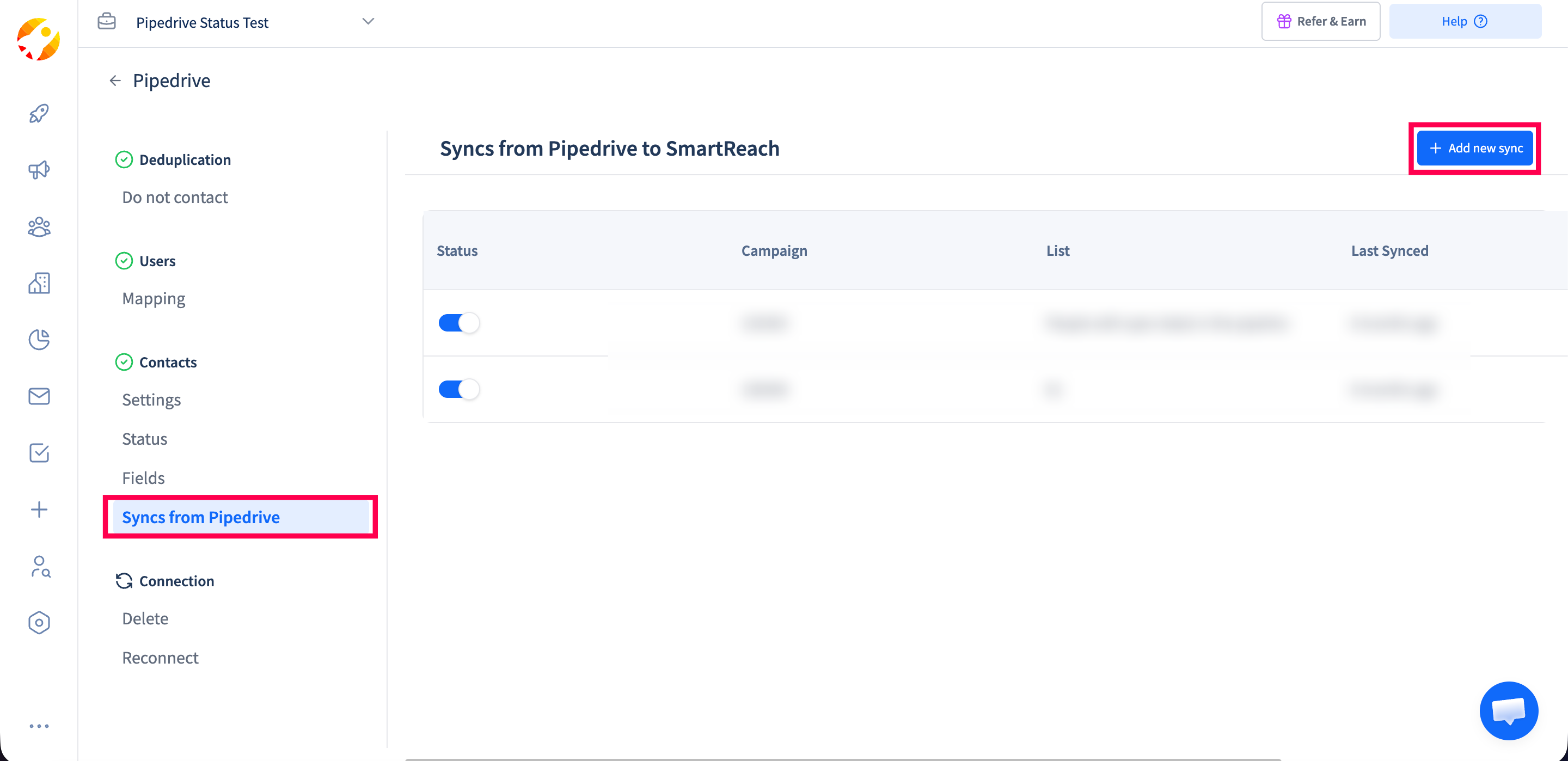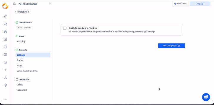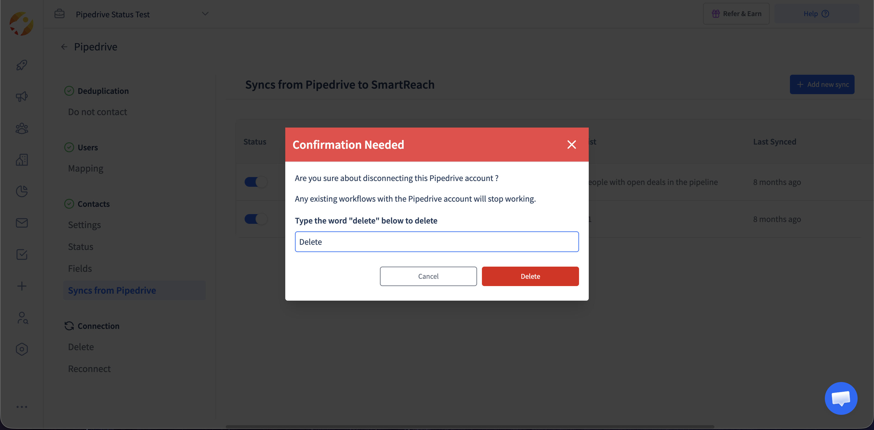 At any given time, if you wish to Disconnect SmartReach from Pipedrive then click on Delete under the Connection tab