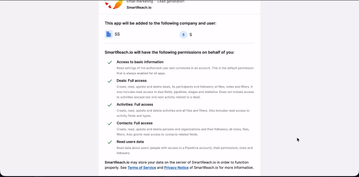 Step 2: Authorise permissions on Pipedrive to let SmartReach.io connect.