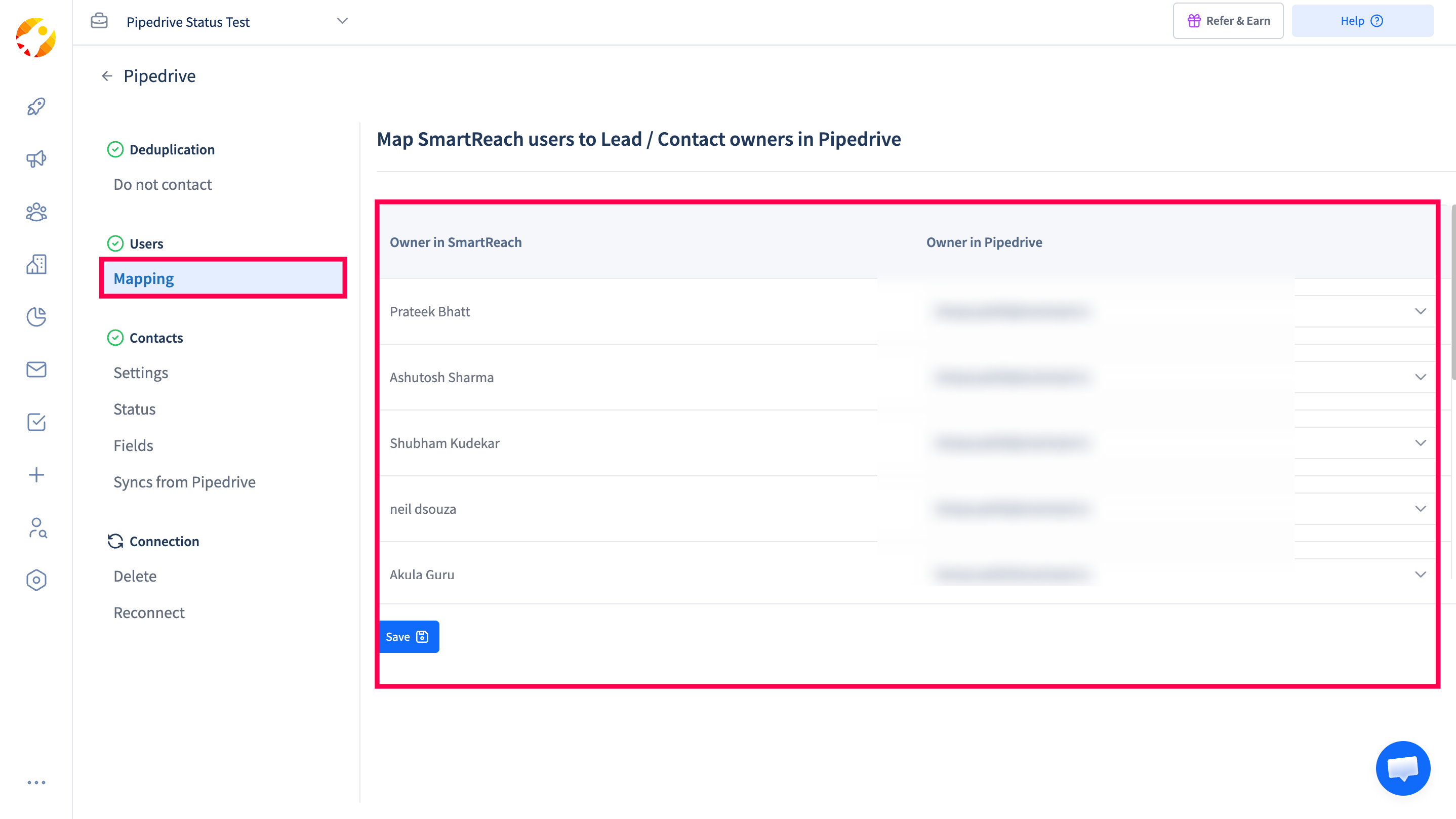 Owners from the Pipedrive CRM can be mapped with a user account in SmartReach. Simply, select the Pipedrive Owner from the drop-down to get it mapped with the User Account in SmartReach and then click on “Save”