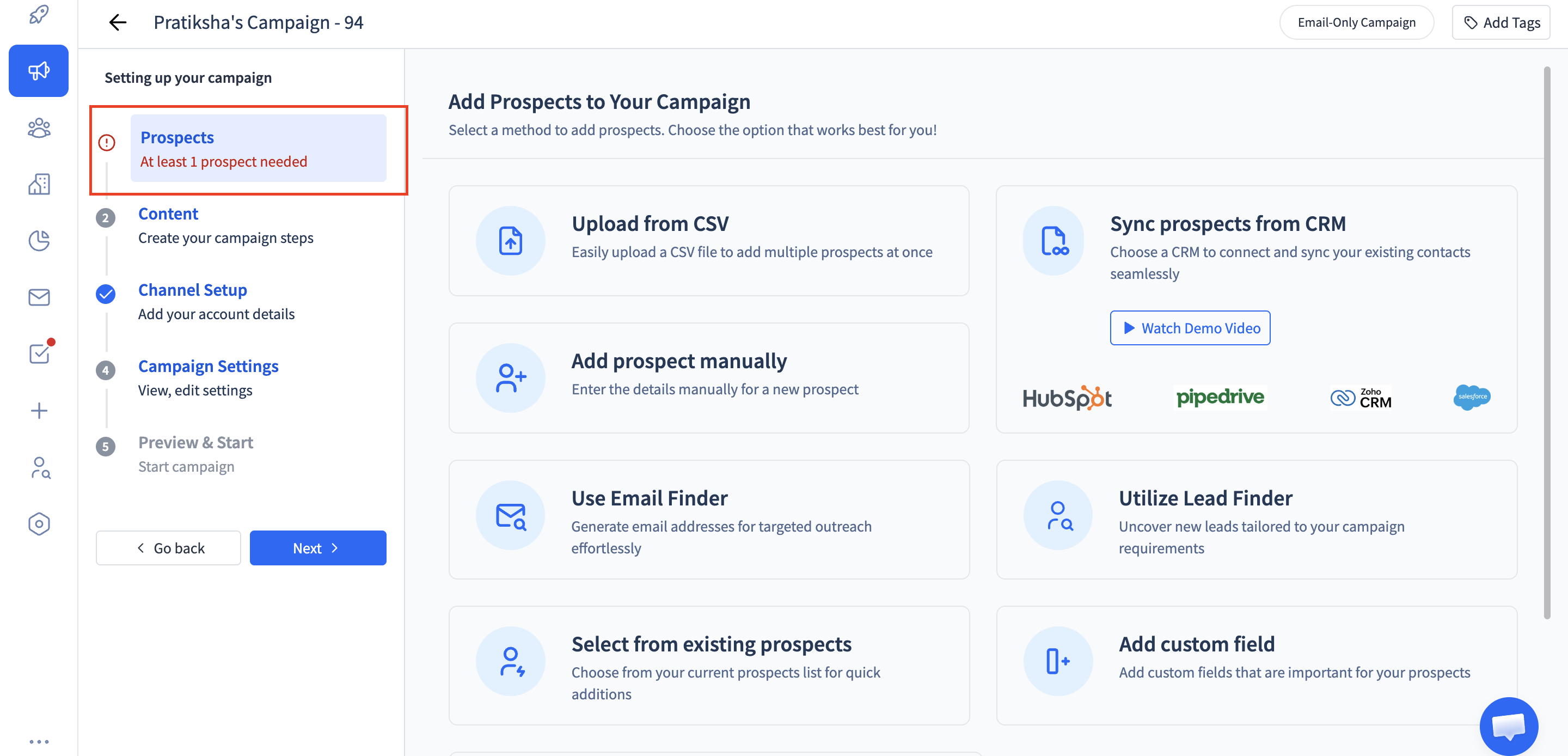 After creating a campaign, you will be redirected to the prospects page. You can also upload prospects by going to the main Prospects page on the top header, or in an existing campaign by going to the Prospects tab.