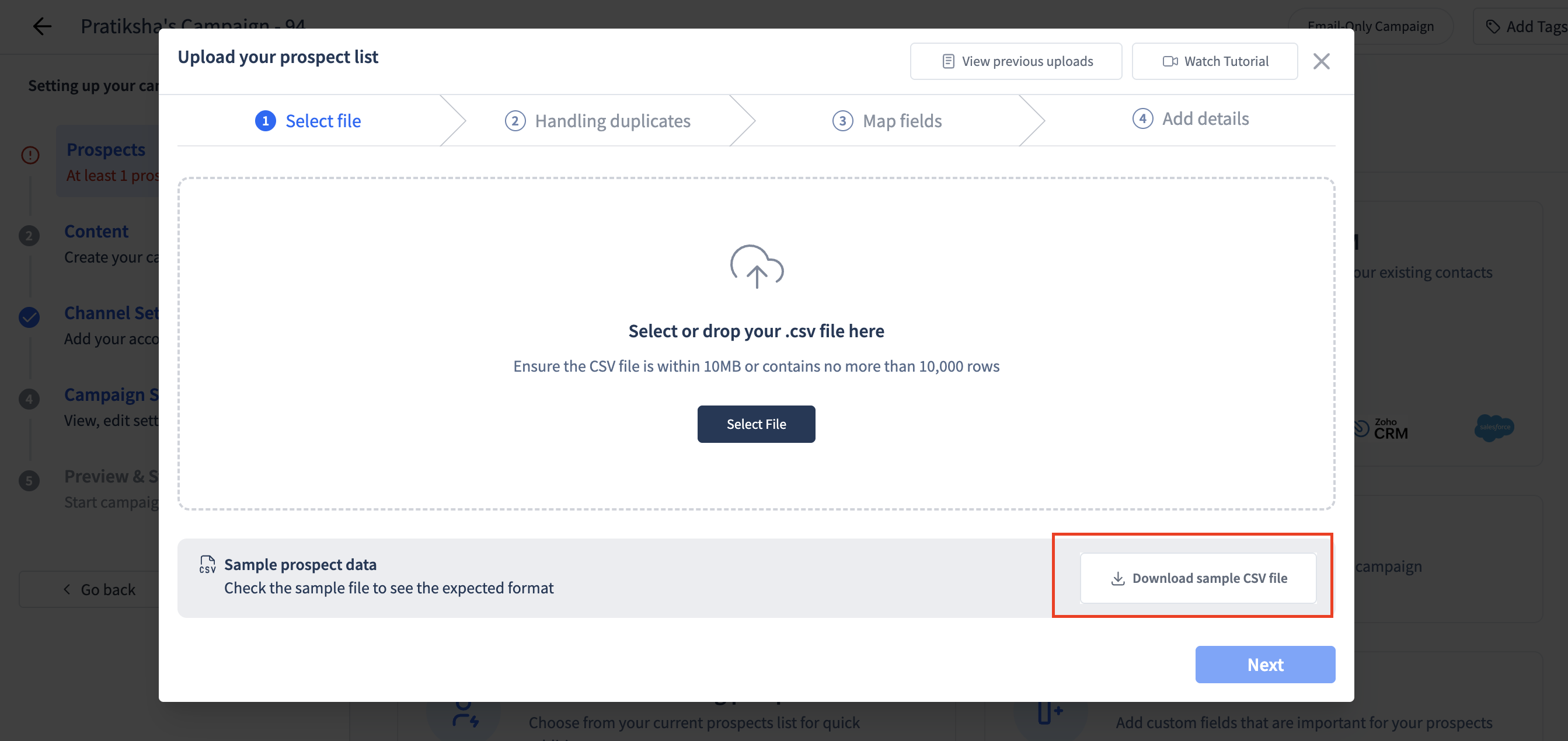 Step 2 - a: Click on Select file and browse to the file path of the CSV from your local storage, or simply drag the CSV and drop it in the shaded region, then click Next.