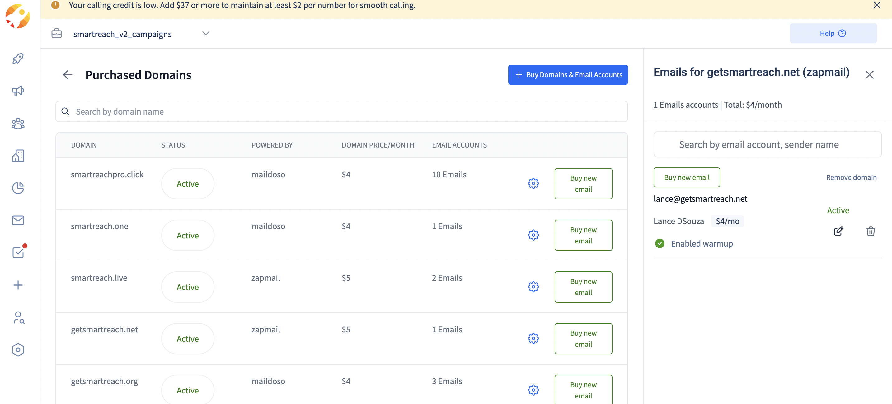 Non-Refundable Purchase:These email accounts and domains are non-refundable. Please be sure to confirm such purchases with your concerned authority, as this amount is non-refundable. **Separate Billing: **The cost of domains and email accounts is separate from your main SmartReach subscription fee.