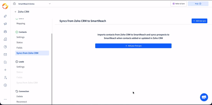 At any given time, if you wish to Disconnect SmartReach from Zoho then click on Delete under the Connection tab.