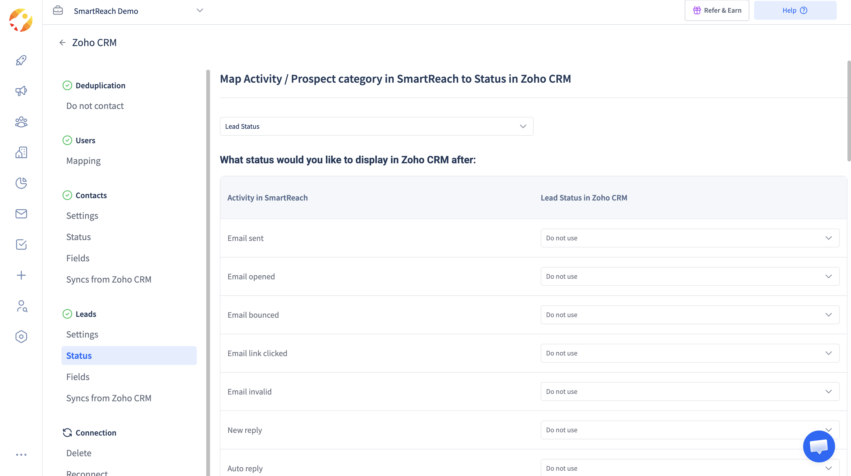 II A) Status Mapping- The lead status can be mapped from SmartReach to Zoho. The different status options of Zoho are automatically displayed in the Zoho dropdown. Based on the activities and prospect categories in SmartReach, the lead status on Zoho can be selected.
