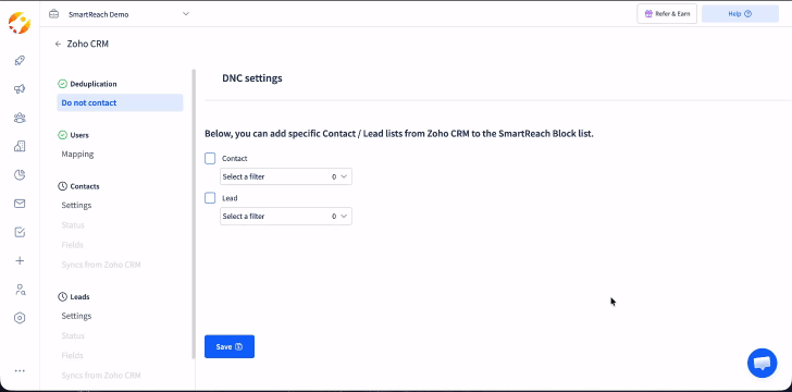 Do Not Contact List: Easily add specific Contact / Lead lists from Zoho to the SmartReach Do Not Contact list.