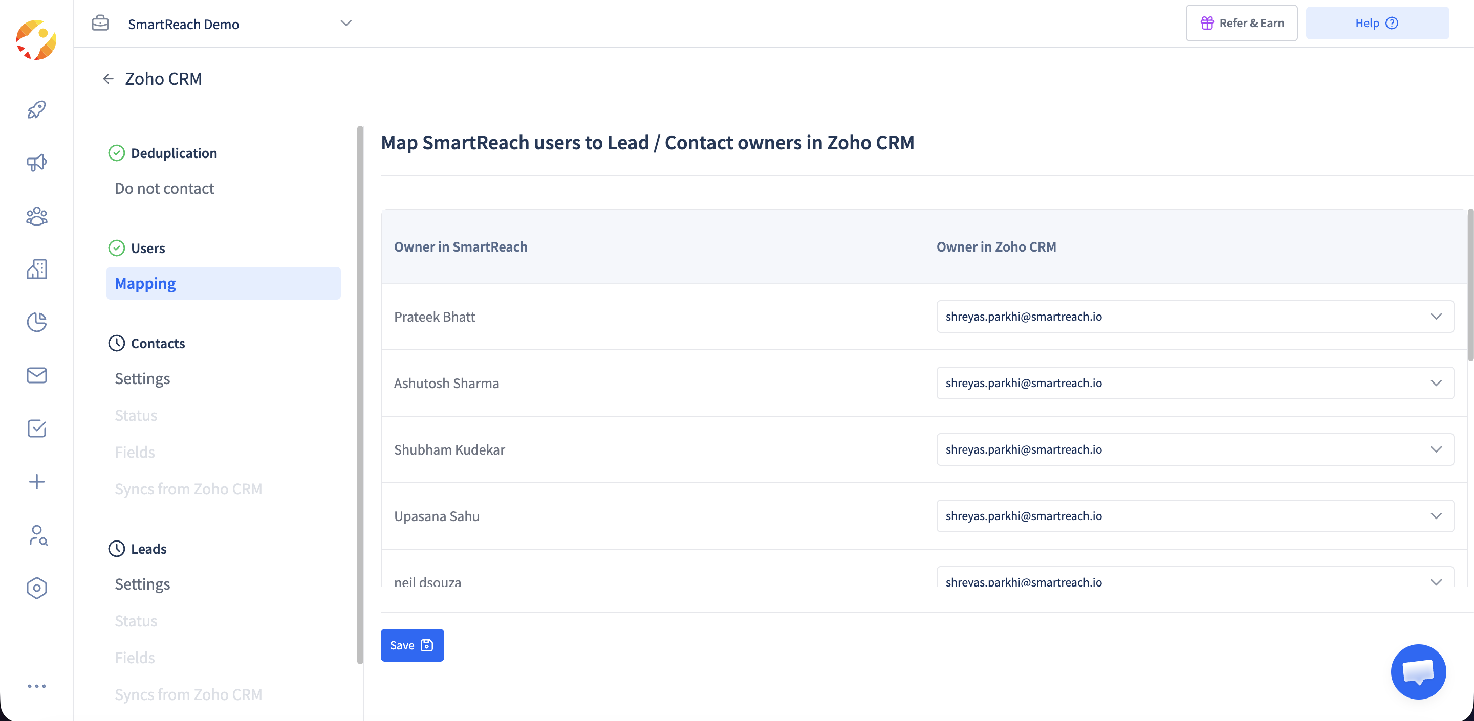 Owners from the Zoho CRM can be mapped with a user account in SmartReach. Simply, select the Zoho Owner from the drop-down to get it mapped with the User Account in SmartReach and then click on “Save”